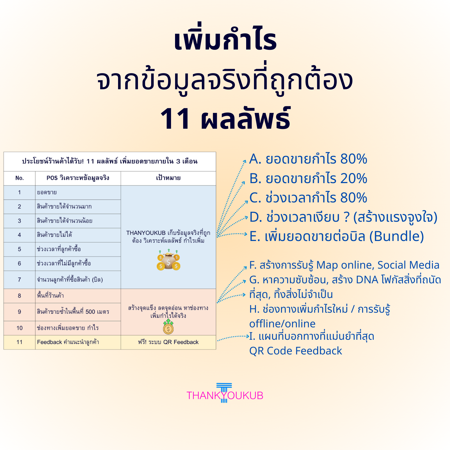 ถ้าคุณเสียเวลาและพลังงานไปกับการรวมยอดขายผ่านกระดาษสามสิบแผ่นมันจะทำให้คุณหมดแรงและหลุดการจดจ่อสิ่งสำคัญที่คุณถนัดที่สุดไปกับเรื่องไม่จำเป็น...Thankyoukub จะช่วยคุณสร้างผลลัพธ์จากข้อมูลจริงที่ถูกต้อง เพื่อคุณจะมีเวลาและพลังงานจดจ่อสิ่งสำคัญให้ได้ผลลัพธ์ที่ต้องการ